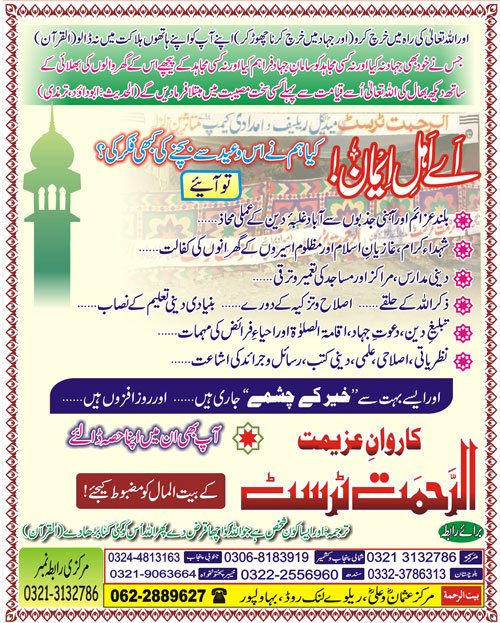 Who is it that will offer of Allah a goodly gift, so He will multiply it to him manifold (Al-Quran) O you who believe! Do you want to spent your wealth in the struggle for all departments of "Deen"? Of course... then step forward Struggle to Predominance of Deen, Social Services, Construction of Mosques, Purification of Soul, Support of Shuhada and Ghazian's homes, Struggle for Islamic Captives, Revivalist of Sunnah, Curriculum of basic religious education, Preaching of Islam, Islamic Madaris, Islamic Media Engaged in practice of above mentioned works. Karwan-e-Azeemat Participate these great good deeds to get countless rewards. Please contact: +92 (62) 2889627, +92 (321) 3132786 Account No.10560-9 Branch Code 957 with the name "Ghulam Murtaza" National Bank Satellite Town Branch Bahawalpur, Pakistan |